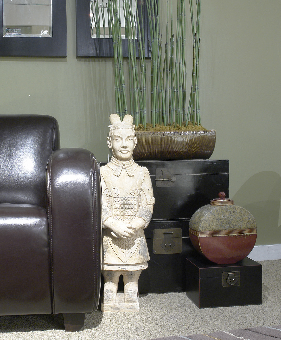 The key to accenting Asian style with contemporary is to keep it clean and simple. One dramatic piece or a collection of smaller pieces easily turn a boring corner into a captivating display.