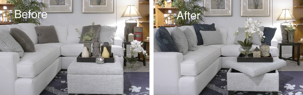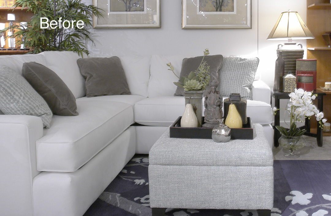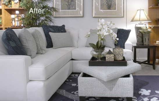 Now this room has allure and interest. The sectional is updated with fashionably blue patterned pillows. The accessories, although different in style, are grouped wisely together by color and shape to create a cohesive designer look.