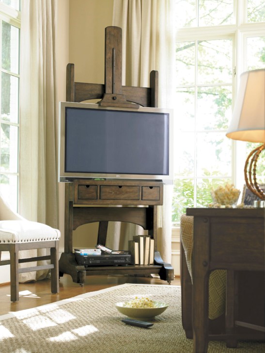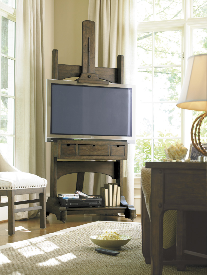 Talk about eclectic! Although the rustic, weathered look is so distinctive, it creates a wonderful background to the modern conveniences of today. This replica of a media easel is adapted to display your HD TV.