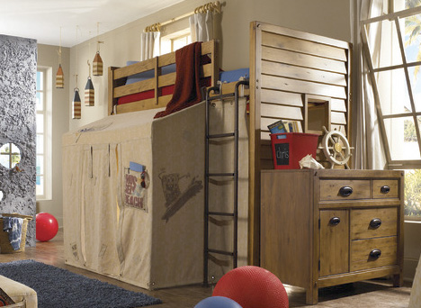 For the kid’s rooms, which are usually smaller, use your vertical space. Tall bookcases, high chests, and dressers offer ample storage for clothing and miscellaneous items. Choose a bunkbed or loft bed with a desk to create a functional room.