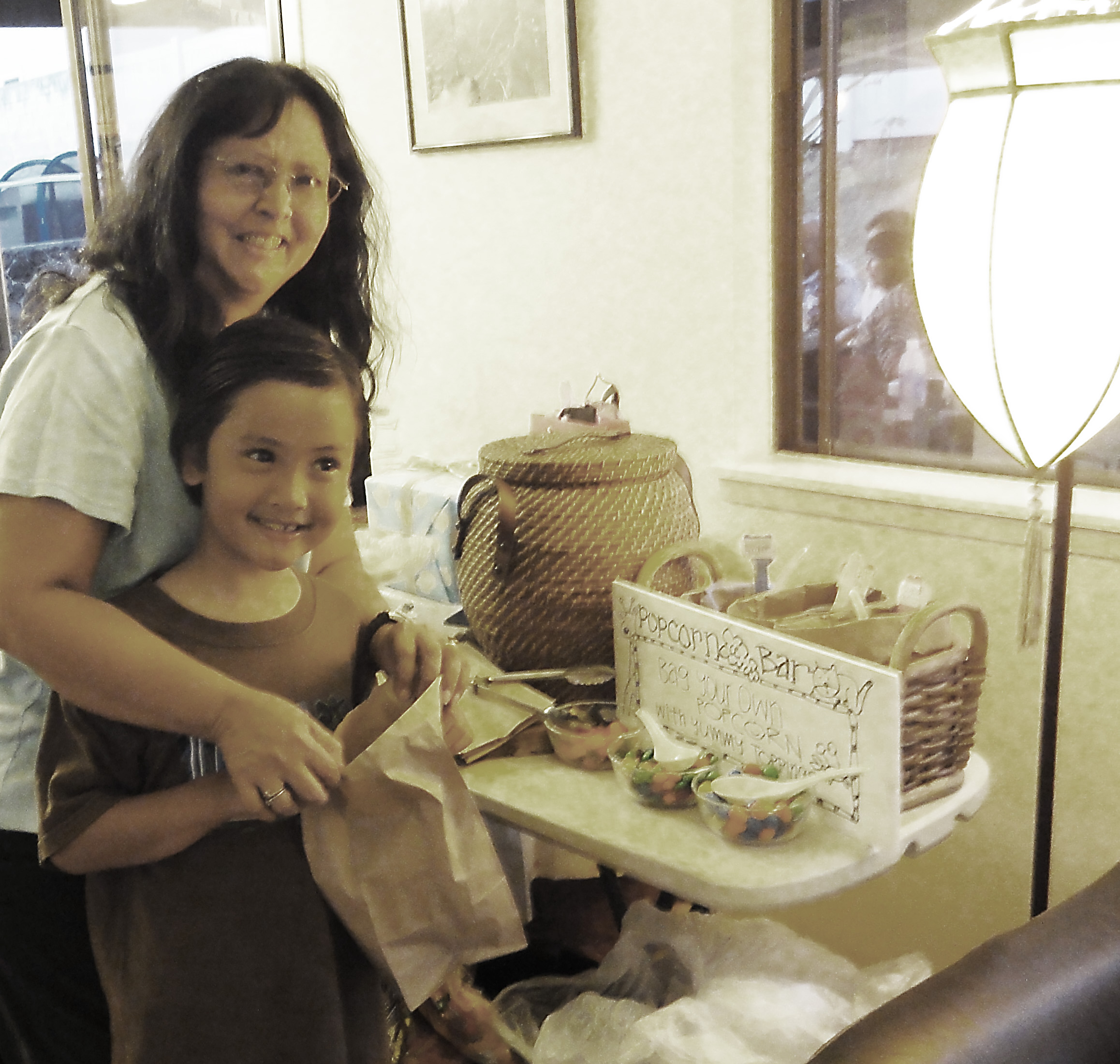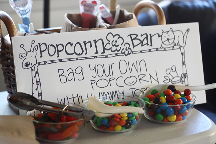 Inside we set up the popcorn bar which turned out to be fun for the kids and adults. One of our friends, Carole later emailed me saying “I LOVED the popcorn bar. Popcorn is one of my favorite snacks!”