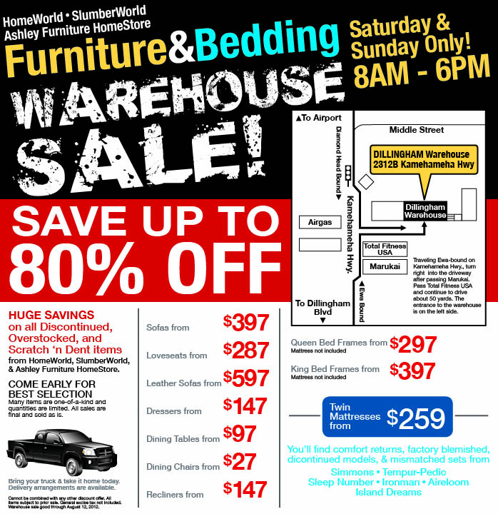Who doesn’t love a bargain? This weekend, August 11 & 12, 2012 is your chance to get bargain basement prices on all our scratch & dent, discontinued & overstocked items at our GIGANTIC Furniture & Bedding Warehouse Sale!