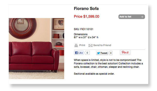 Every product is listed with a price. You can print product pages, email them to your friends, and save your favorites to a wish list. You can also share any pictures that you “like” on your Facebook, Twitter, or Pinterest boards.