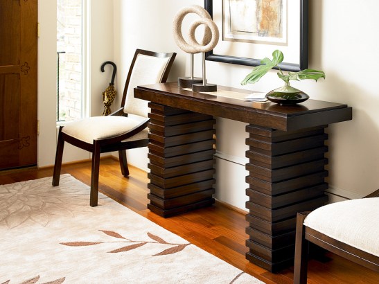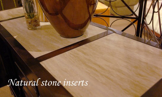 Who wouldn’t love the dark coffee bean finish of the collection. The solid construction of selected hardwoods and mahogany veneers shows master craftsmanship with its architectural silhouettes and design details. The credenza and occasional tables have natural stone inserts that are beautiful and distinctive.