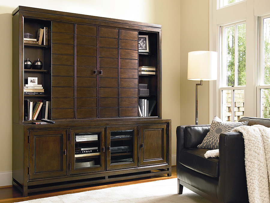 The entertainment hutch (top) is the ideal display for your TV. Large bi-fold doors conceal your screen when not in use. The entertainment console (base) has adjustable shelves and interchangeable door panels, giving you the option for wood or speaker cloth doors.
