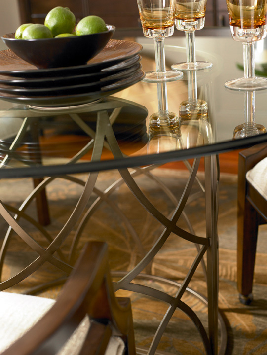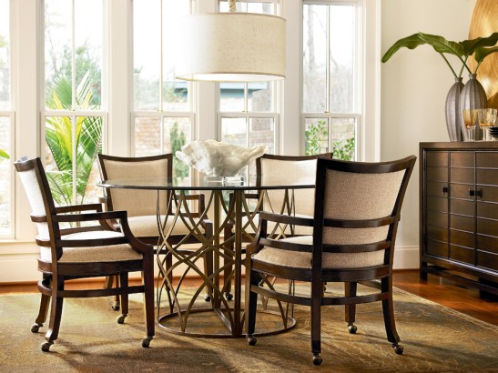 The Latitude dining table has a distinctive banded antique bronze hardware base with a 52″ round glass-top. Its uniqueness definitely brings character and craftsmanship to your room. Dark mahogany veneer arm chairs are available with or without casters. I personally like the easy mobility of the casters.