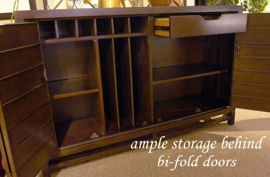 The credenza has bi-fold doors to conceal the ample shelves for platters and other serving trays. Also has an organized area for your wine collection.
