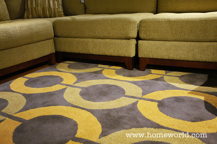 Bold colors bring this room to life. Halton Area Rug (5’x7.5′) is shown here with the Brody Sectional by Jonathan Louis.