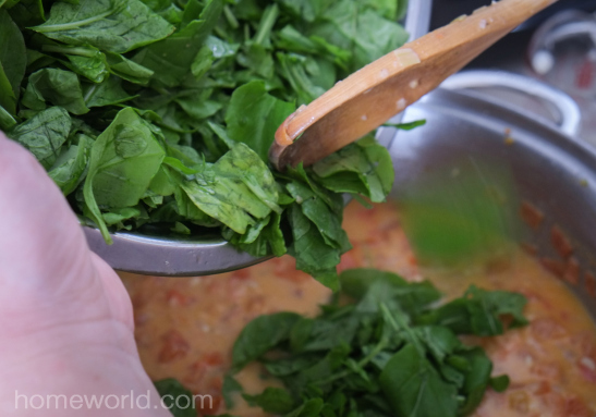 Turn the heat to high. Stir in the stock and scrape up the brown bits that cling to the bottom of the pan with a wooden spoon. Cook until most of the liquid has evaporated, about 2 minutes. Remove the pan from the heat and add the arugula (or spinach), mascarpone cheese, and chopped shrimp.