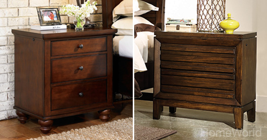 Recharge in the top drawer keeps cords out of sight. Both nightstands are available at homeworld.com