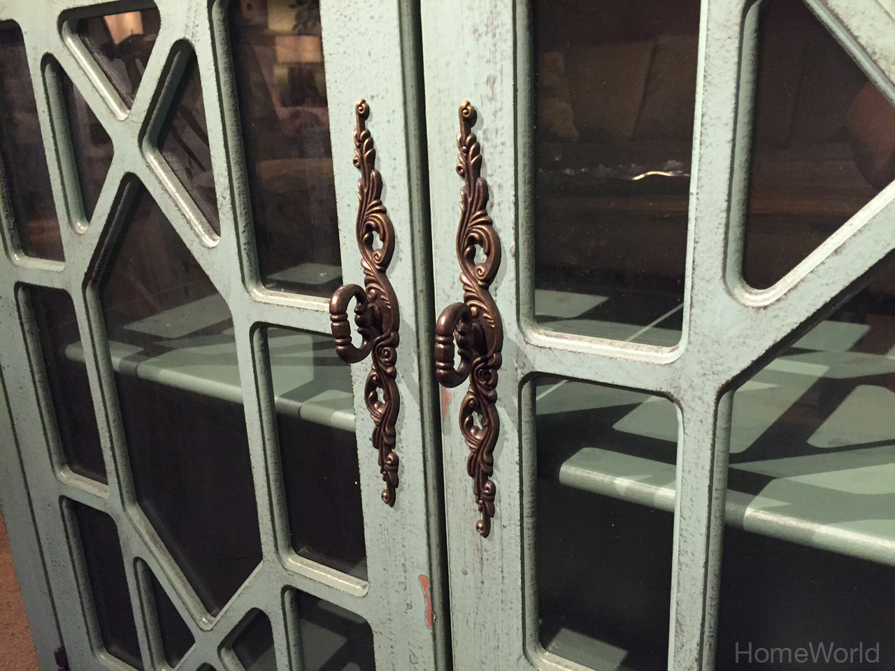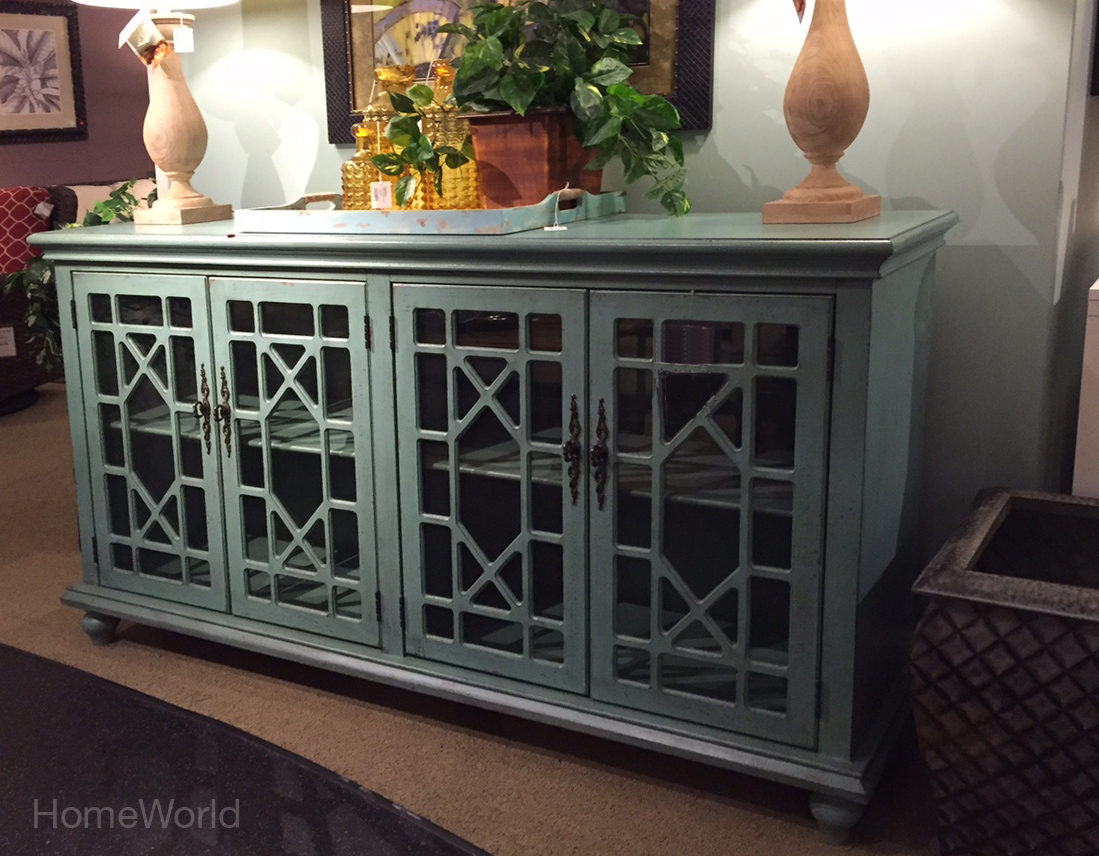Wood accent 4-door cabinet with metal door handles looks great in an entry or dining room. Available at homeworld.com