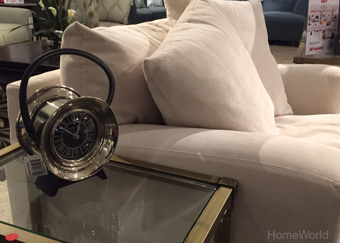 This steel clock accessory from HomeWorld adds a contrasting edge next to this contemporary living room chair.