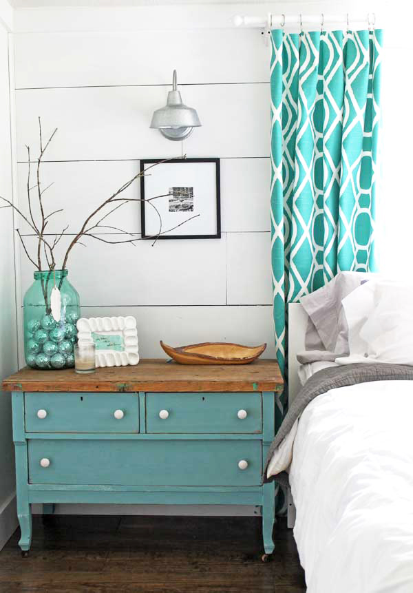Farmhouse style doesn’t have to be only white. The horizontal shiplap wall is pure farmhouse style with teal accessories. Photo source: www.theshabbycreekcottage.com