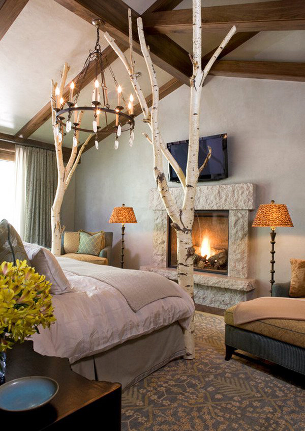 As if the fireplace alone isn’t enough. The tree branches and rustic chandelier are the icing on this luxurious room. Photo source: www.hative.com