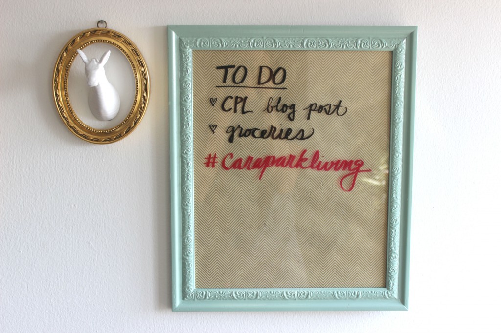 Tip: Make your own wipe board with dry erase pens and glass. The glass is much easier to clean than your typical dry erase board. Frame pages from your calendar for a DIY organizer for your whole family.