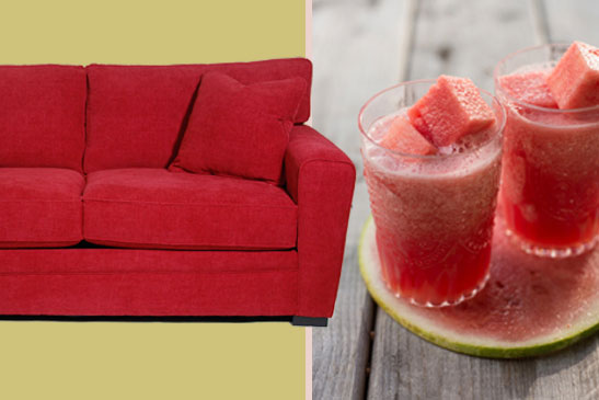 Left: Artemis Red Sofa by Jonathan Louis. Right: watermelon margaritas from bhg.